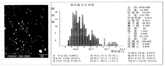 本產(chǎn)品由北京市海淀區(qū)產(chǎn)品質(zhì)量監(jiān)督檢驗(yàn)所依據(jù)北京市質(zhì)量監(jiān)督局《納米材料質(zhì)量檢驗(yàn)評(píng)價(jià)規(guī)則》進(jìn)行檢測(cè),測(cè)試透射電鏡照片如圖5所示,照片中呈現(xiàn)出分散均勻的納米粉體。該產(chǎn)品為100%納米粒子。顆粒平均粒徑為24nm,粒徑分布范圍在6~66nm,其中有%顆粒粒徑分布在6~40nm范圍。該產(chǎn)品在水處理、凈化空氣、抗菌防霉、屏蔽紫外線等方面,都顯示出很好的功能。