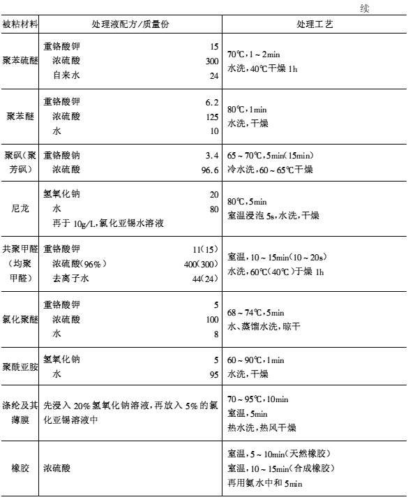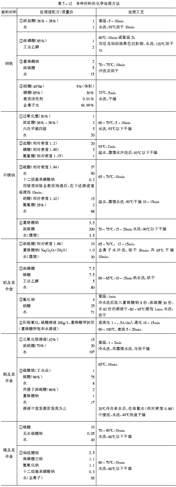 化學處理用的氫氟酸是劇毒物質,鉻酸及鉻酸鹽毒性也很大,硫酸、硝酸、氫氧化鈉等都有強腐蝕性,使用時一定要特別當心,注意安全,通風良好,防止中毒,避免傷害,減少泄漏,保護環境。化學處理后的廢液及沖洗用水應進行必要的處理,不可隨意排放造成環境污染。由于六價鉻的高毒性和致癌性,近年來,德國漢高公司開發了鋼鐵、鋁合金的表面處理無鉻化技術。表7-12列舉了各種材料化學處理方法。金屬粘接前的處理可參考ASTMD2651-01標準,結構粘接的鋁表面磷酸陽極化處理方法參見ASTMD 3933-98標準,塑料粘接前表面處理方法可參考ASTMD 2093-97標準。國內已開發成功一種金屬粘接前KJ型表面處理劑,主要成分為環己六醇六磷酸酯,能與金屬反應生成絡合物,在金屬表面形成一層致密單分子保護膜,阻止氧氣和濕氣對金屬的腐蝕,且與環氧膠結合力強。實踐證明,完全可以替代傳統的磷化工藝,高效、無毒、環保。